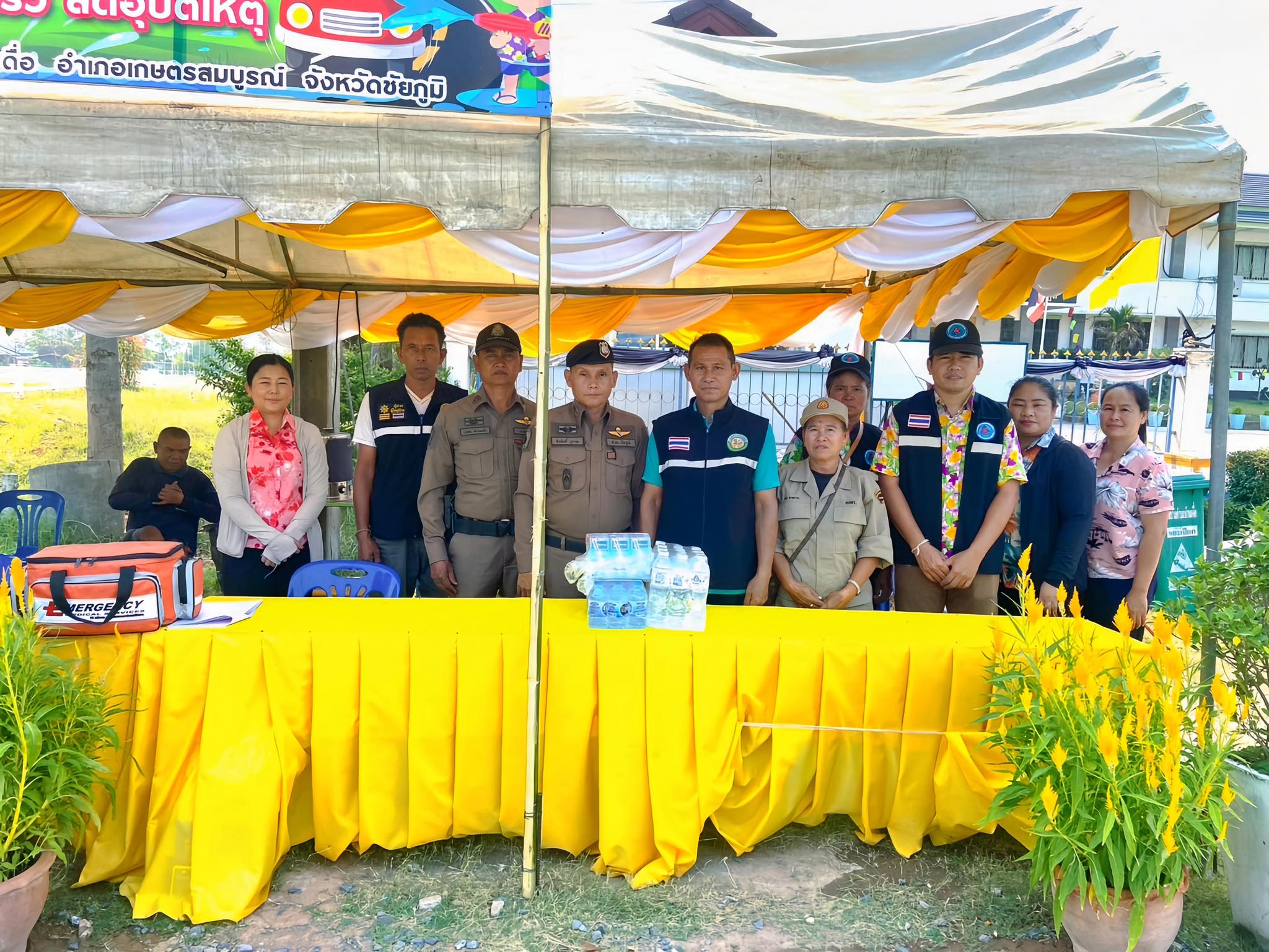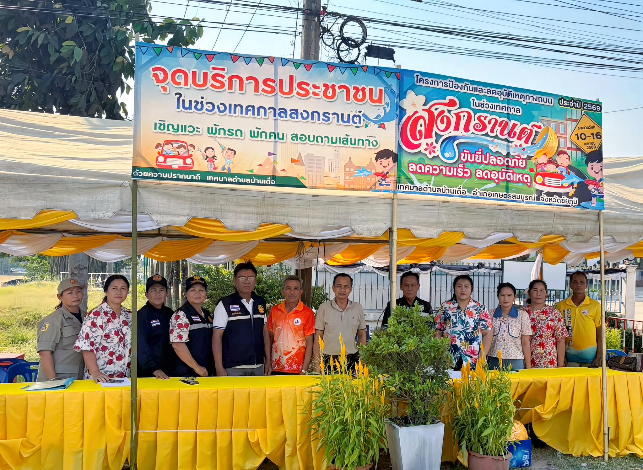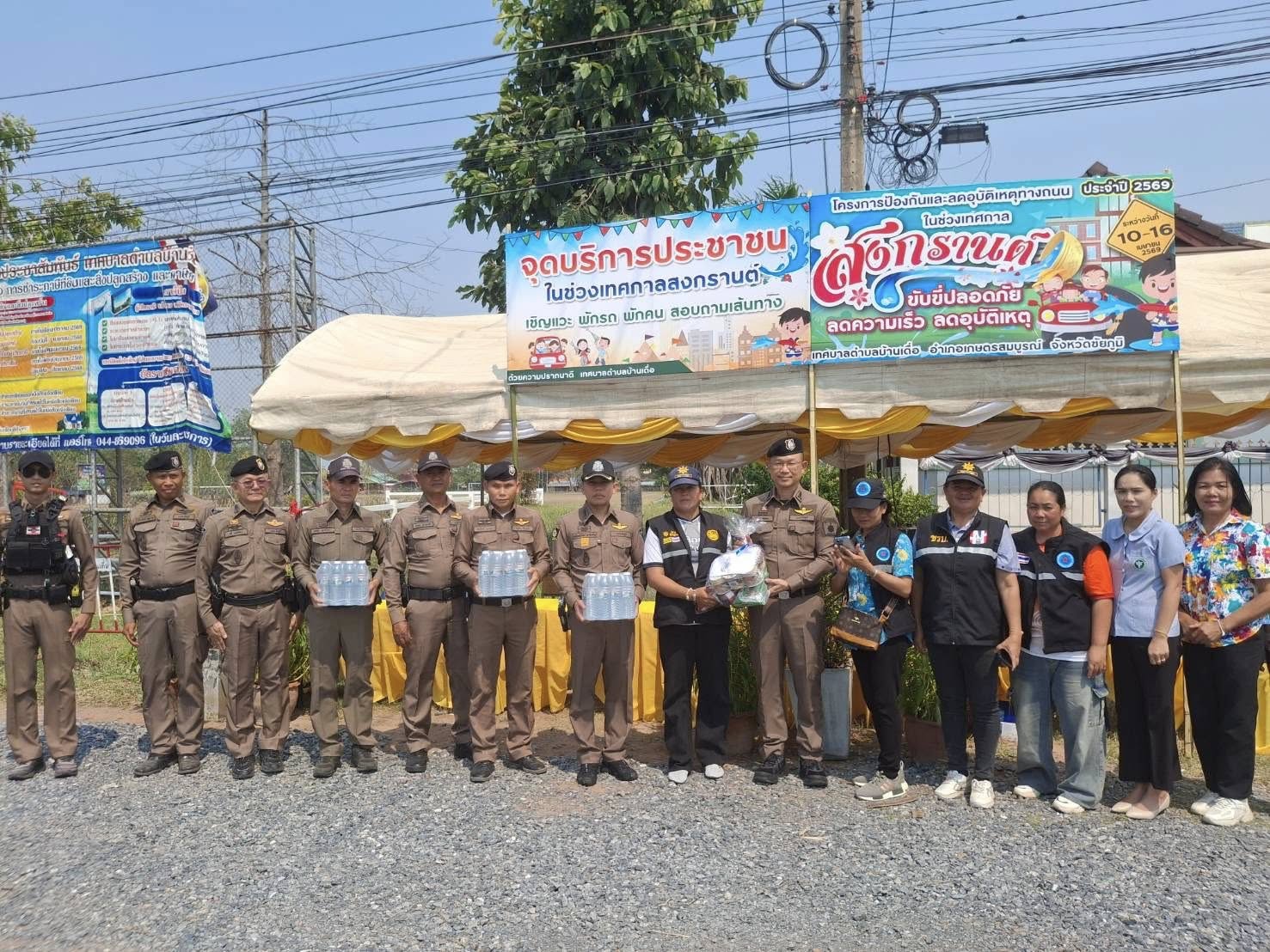 นายอนันต์ นาคนิยม ผู้ว่าราชการจังหวัดชัยภูมิ พร้อมด้วยนางศิริพร นาคนิคม ประธานแม่บ้านมหาดไทยจังหวัดชัยภูมิ ลงพื้นที่ออกเยี่ยมจุดตรวจหลัก บริเวณหน้าสำนักงานเทศบาลตำบลบ้านเดื่อ อำเภอเกษตรสมบูรณ์ จังหวัดชัยภูมิ ในวันที่ 12 เมษายน 2569 มอบสิ่งของ น้ำดื่ม และให้ขวัญ กำลังใจ พร้อมคำแนะนำแก่เจ้าหน้าที่ผู้ปฏิบัติงานประจำจุดตรวจช่วงเทศกาลสงกรานต์ พ.ศ. 2569